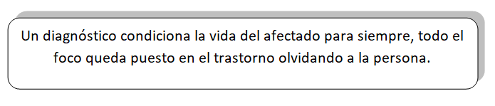 La palabra diagnóstico significa “conocimiento a través de” tendría que ser un comienzo para saber qué pasa y generar tranquilidad, no un final.  Porque el afectado se convierte en una descripción de síntomas quedando encarcelado sin puertas para la propia recuperación. El diagnóstico produce sentimientos de humillación y de inutilidad, genera roles de enfermo que dificulta la rehabilitación.
