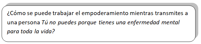 ¿Cómo se puede trabajar el empoderamiento mientras transmites a una persona Tú no puedes porque tienes una enfermedad mental para toda la vida? Detrás del diagnóstico hay un recorrido macabro, te hunde de por vida que no te dejen margen de maniobra, te infantiliza como si ya no tuvieras poder de decisión: casi todo se habla y se decide a sus espaldas.